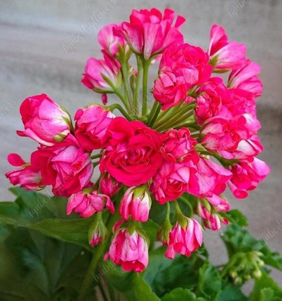 Куст компактный, формируется самостоятельно, хорошо облиственный. Листочки зеленые, зональные, с небольшим опушением. Цветы прочные и короткие, бутоны выглядят как розочки. Это крупноцветковая пеларгония, розовидная, густомахровая. Окрас ярко-алый.